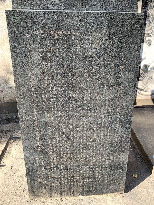 御堂の目の前に、弁財天像が上に乗った由緒書の石碑がある。